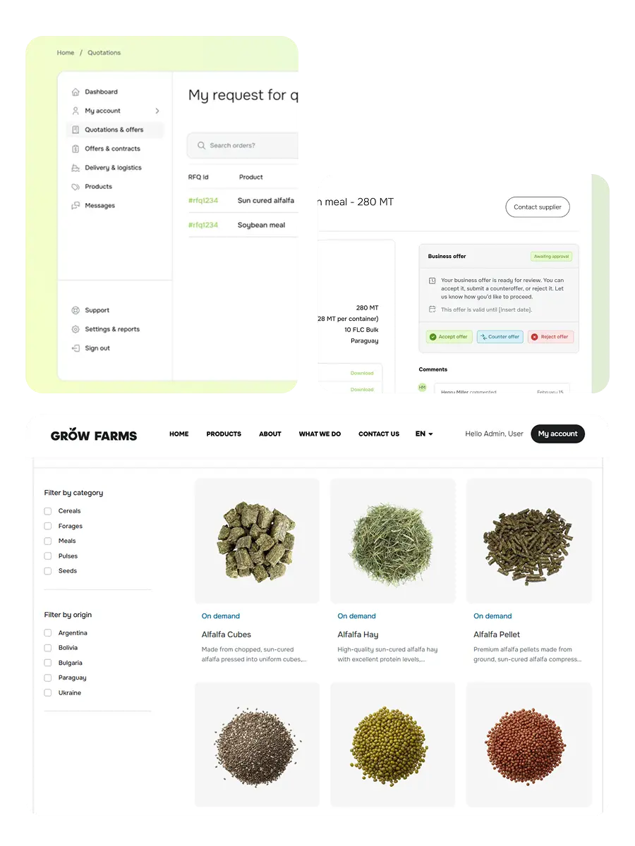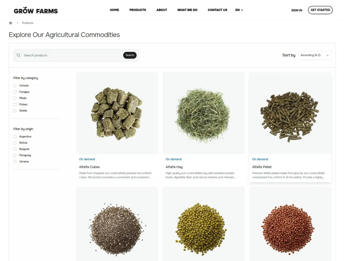 You can buy products such as forage, feed, and grains with detailed specifications and real-time availability. See the full catalogue here.